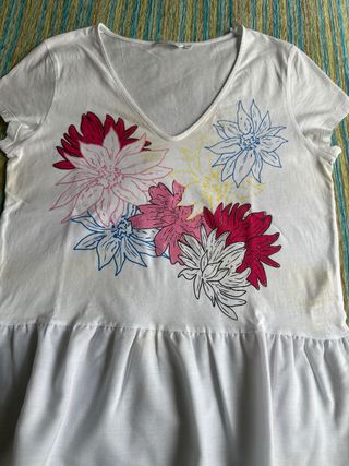 Preciosa camiseta de algodón, blanca con estampado floral multicolor. Es de manga corta y tiene un vuelo en la parte inferior. Está en buen estado, aunque presenta algunas pequeñas manchas. - Talla: No especificada. - Estilo: Casual. - Material: Algodón.