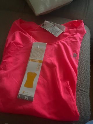 Preciosa camiseta deportiva de la marca Domyos, en color rosa y talla XL. Es ideal para hacer ejercicio. -Perfecta para usarla en tus sesiones de entrenamiento. -Se encuentra en muy buen estado. -Te encantará su comodidad y estilo.