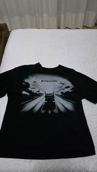 Camiseta de la marca Pleasures con un diseño gráfico llamativo en la parte delantera. Es una prenda cómoda y con estilo. - Diseño frontal con un camión en carretera. - Estampado en blanco y negro.