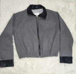 Blusa de manga larga con un diseño moderno y detalles en contraste. Preguntar por precios - Cuello estilo bomber en material sintético negro. - Puños anchos en material sintético negro. - Cremallera frontal plateada. - Bajo elástico. - Tejido principal de punto gris.