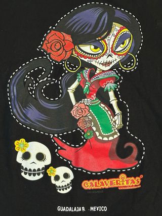 Camiseta con un diseño vibrante de Calaveritas de Guadalajara, México. Presenta una figura de catrina con detalles coloridos y calaveras. - Diseño de catrina estilo Calaveritas. - Ilustración de calaveras. - Estampado Guadalajara - Mexico.