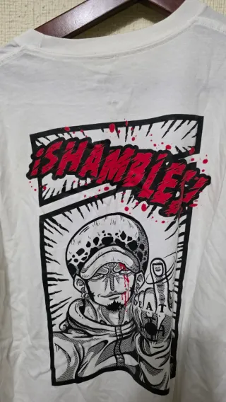 Camiseta blanca con diseño del personaje Law de One Piece. - Talla XL. - Ilustración estilo cómic con el texto SHAMBLES!. - Manga corta.