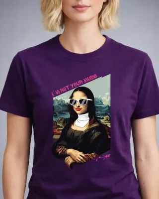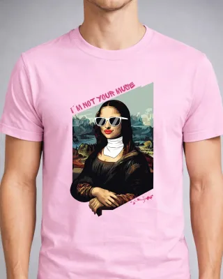 Camiseta con un diseño artístico de la Gioconda con gafas de sol y el texto I'M NOT YOUR MUSE. - Ilustración estilo pop art - Fondo de paisaje abstracto - 100% algodón - Calidad premiun - Diferentes colores - Diseño propio de Irónika