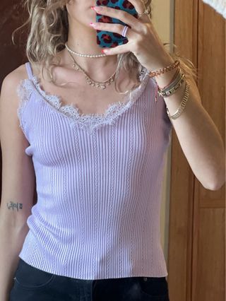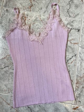 Este top lencero de Giorgia es una prenda delicada y con estilo. - Tejido de canalé acanalado. - Detalle de encaje en el escote. - Tirantes finos.