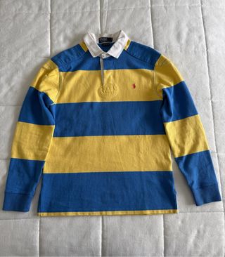 Polo de manga larga estilo rugby de Ralph Lauren. - Diseño de rayas horizontales azul y amarillo. - Cuello blanco. - Logo de la marca bordado en rojo.