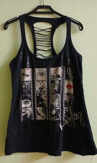 Camiseta negra de Bershka con un diseño llamativo. - Estampado estilo photocall con imágenes. - Espalda con tiras cruzadas y cortes. - Detalle de brillo en el estampado. Muy buen estado.