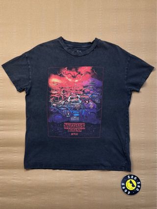 Camiseta original Stranger Things x Netflix. Talla S en la etiqueta — queda mejor como M normal o S oversize. Medidas (cm): Largo – 64 De sisa a sisa – 53 Hombros – 52 Manga – 12,5 Estado: Sin agujeros ni manchas. El gráfico está en excelente estado. El tejido tiene un lavado negro deslavado que le da un estilo vintage. En excelente estado general. Detalles: • 100% algodón • Merch oficial de Netflix x Stranger Things • Gráfico grande y colorido del skyline de Hawkins • Lavado negro con estilo vintage • Tejido suave de grosor medio • Etiqueta interior impresa para mayor comodidad