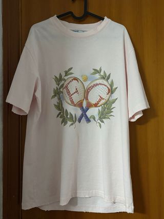 Camiseta de la marca FAKE GODS en color rosa. - Diseño con palas de tenis y laurel. - Estilo casual y moderno.