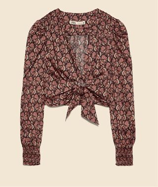 Precioso top de Zara con un estampado floral vibrante. Es una pieza versátil y con mucho estilo. - Diseño cruzado con nudo. - Mangas largas abullonadas. - Detalle de aro metálico.