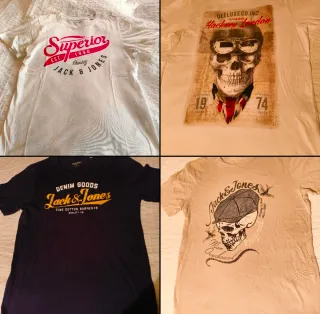 Pack de cuatro camisetas de la marca Jack & Jones.Talla S-M. - Camiseta blanca con estampado Superior. - Camiseta blanca con estampado de calavera Deeluxe Co. Inc.. - Camiseta negra con estampado Denim Goods. - Camiseta beige con estampado de calavera Man Overboard. Todas juntas por 10€. También las puedo vender por separado. casual informal básico esqueleto motero rock águila eeuu usa clásico estilo
