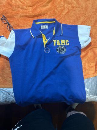 Polo de manga corta con detalles en contraste. - Diseño con logo y texto F&MC en el pecho. - Cuello tipo polo con botones. - Mangas blancas. - Ribetes amarillos en cuello y mangas. Precio negociable