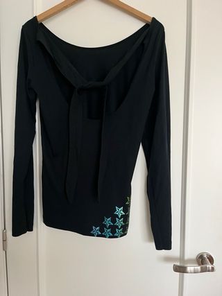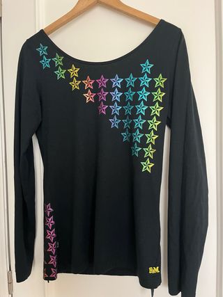 Camiseta de manga larga con un diseño llamativo de estrellas. - Estrellas estampadas en degradado arcoíris. - Diseño de estrellas en la parte superior delantera y en un lateral inferior. - Cuello redondo. - Logo de la marca en la parte inferior.