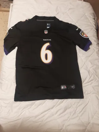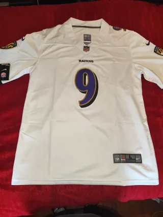 Camiseta de fútbol americano de los Baltimore Ravens. - Diseño oficial de Nike. - Número 9 en color morado y dorado. - Parches de equipo en las mangas.