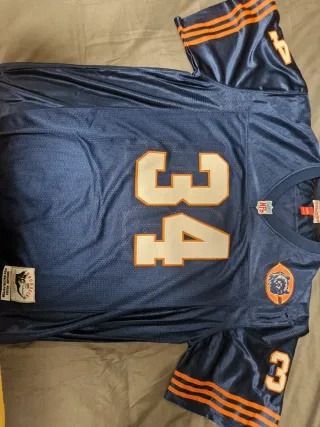 Camiseta de fútbol americano de los Chicago Bears, número 34, de Walter Payton. Diseño clásico con detalles en naranja. - Número 34 en blanco con borde naranja en el frente. - Logo de los Bears en el pecho. - Número 3 en la manga. - Rayas naranjas en las mangas.