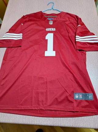 Camiseta de fútbol americano de los San Francisco 49ers. - Diseño con el número 7 de Kaepernick (quarterback) - Detalles a rayas rojas en las mangas. - Logo de la NFL y Nike visibles. Fundador de la campaña Know yout rights Sin usar, con etiqueta