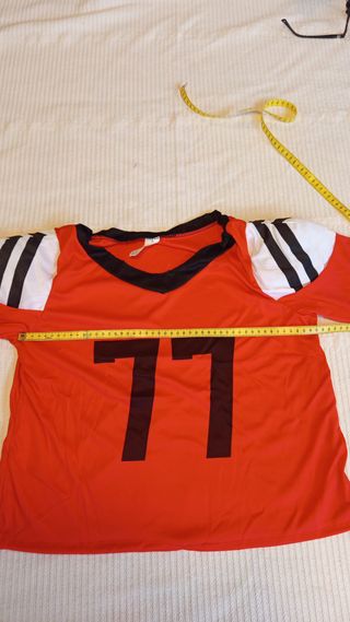 Disfraz de jugadora de fútbol americano. - Camiseta roja con número 77 en negro. - Pantalón blanco. - Incluye mangas, bandana y calcetas. - Presenta 3 manchas amarillas en la parte trasera, que se ven poco.