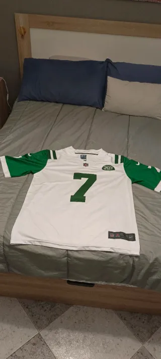 Camiseta de fútbol americano de los New York Jets. - Color blanco con detalles en verde. - Número 7 bordado en la parte delantera y trasera.