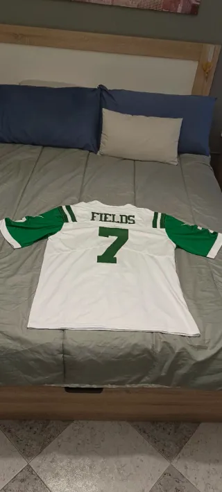 Camiseta de fútbol americano de los New York Jets. - Diseño con el número 10 en verde. - Mangas con detalles de rayas verdes. - Logo de los Jets en el pecho. - Talla Xl de niño, equivalente a una M de adulto