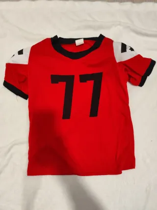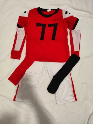 Conjunto de disfraz inspirado en el fútbol americano. Incluye camiseta y pantalón. - Camiseta roja con detalles blancos y negros. - Número 77 en la camiseta grande. - Número 99 en la camiseta pequeña. - Pantalón blanco con detalles rojos y negros.