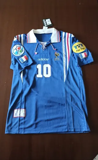 Camiseta de fútbol retro de Francia de la Eurocopa 96. Producto original. - Diseño clásico de Adidas. - Número 10 estampado en blanco. - Escudo de la FFF y logo de Fair Play. - Parche de la Eurocopa 96.