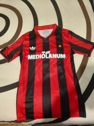 Camiseta de fútbol retro del AC Milan. - Diseño a rayas rojas y negras. - Logo de Adidas en blanco. - Patrocinador MEDIOLANUM en el frontal. - Estrella dorada en el pecho.