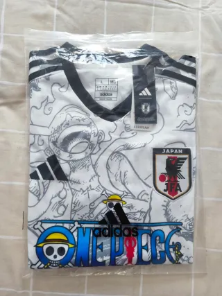 Camiseta de fútbol Adidas con un diseño inspirado en One Piece. - Diseño gráfico de One Piece. - Logo de Adidas. - Escudo de Japón y JFA.