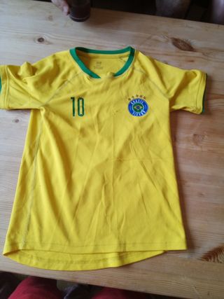 Preciosa camiseta de fútbol de la selección brasileña. Es de color amarillo y verde, y luce el número 10. Está en buen estado, aunque presenta algunas señales de uso. - Talla: No especificada en la imagen. - Diseño: Con el logo de Brasil y el número 10.