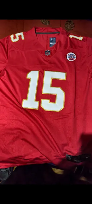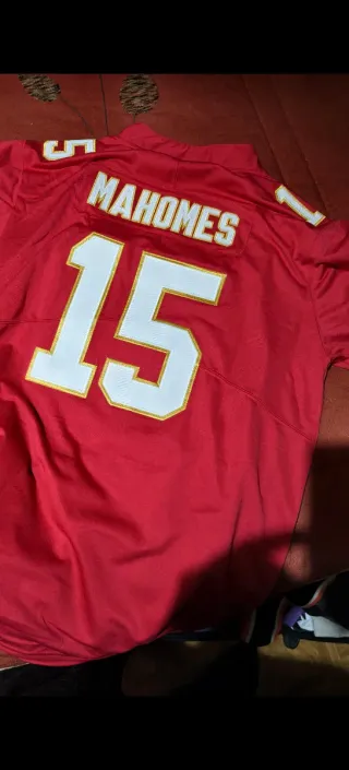 Camiseta de fútbol americano de la NFL, marca Nike, en color rojo. número 15 de Patrick Mahomes en blanco con borde dorado en la parte frontal y números en las mangas. - Kansas City Chiefs. - Parche de la NFL en el cuello. - Logo de Nike en la etiqueta.
