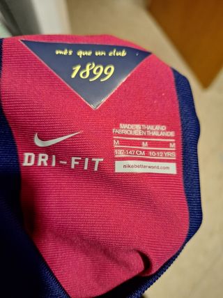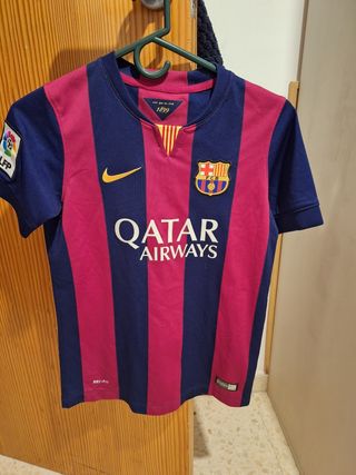 Precio negociable Camiseta de fútbol del FC Barcelona, modelo de manga corta. - Diseño a rayas verticales rojas y azul marino. - Cuello en V con detalles amarillos. - Logo de Nike y escudo del club bordados. - Inscripción Qatar Airways en el frontal. - Parche LFP en la manga izquierda.