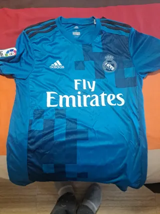 Camiseta de fútbol del Real Madrid. - Diseño con detalles en color teal. - Logo de Adidas y escudo del equipo. - Inscripción Fly Emirates en el frontal. - Parche de la Champions League en la manga. - Tecnología Climacool para mayor transpiración.