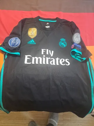 Camiseta de fútbol del Real Madrid. - Diseño en color negro con detalles en verde azulado. - Logo de Adidas y escudo del equipo. - Parche de campeón de la Champions League. - Inscripción 'Fly Emirates' en el frontal.
