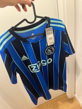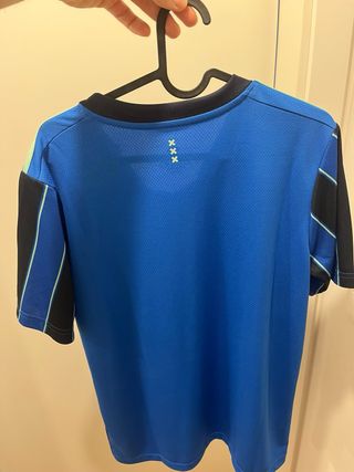 Camiseta de fútbol del Ajax. - Diseño a rayas azules y oscuras. - Detalles en color menta. - Logo de Adidas en el pecho. - Escudo del Ajax en el pecho.