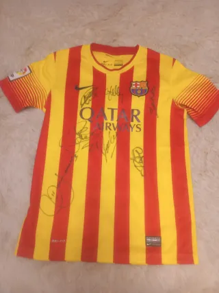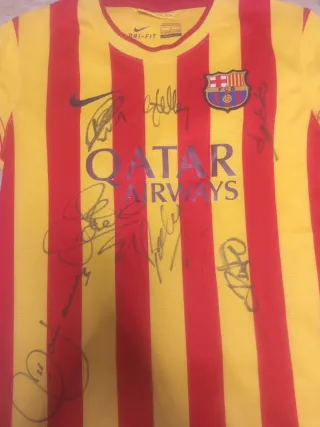 Camiseta de fútbol del FC Barcelona con múltiples firmas de jugadores. - Diseño a rayas rojas y amarillas. - Logo del FC Barcelona bordado. - Firma de jugadores en la parte frontal.