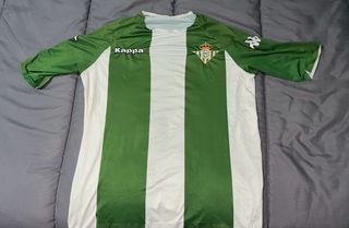 Camiseta de fútbol del Betis. - Logo de Hummel bordado. - Escudo del club bordado. - Sin roturas ni manchas. - Presenta algunos desgastes en las mangas, pero es muy poco, no está prácticamente usada.