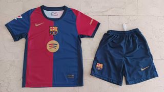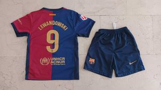 Equipación de fútbol del FC Barcelona de Robert Lewandowski. - Camiseta y pantalón. - Talla aproximada 140, para niños de unos 7/8 años. - Número 9 y nombre 'Lewandowski' en la espalda.