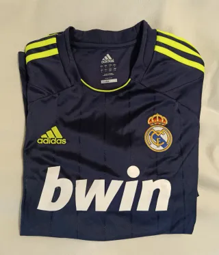 Camiseta de fútbol del Real Madrid, talla L. Es de color azul marino oscuro con detalles en amarillo neón. Adidas ClimaCool. Escudo del Real Madrid bordado. Sponsor "bwin" en el pecho. - Parche 110 aniversario 2012. - Nunca usada. - No envío