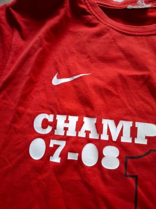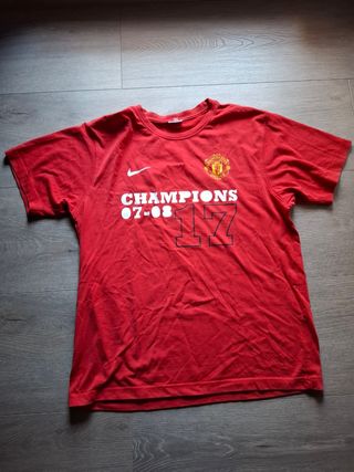 Precio original ultima foto: Camiseta de fútbol Manchester United, de color rojo. Es una camiseta de manga corta con el logo del equipo y el texto "CHAMPIONS 07-08 17". La camiseta muestra señales de uso, como se puede apreciar en las imágenes.