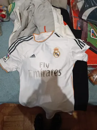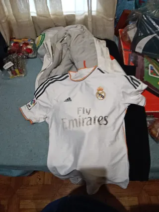 Camiseta de fútbol vintage del Real Madrid, usada por Isco. - Diseño clásico blanco con detalles negros. - Logo de Adidas y escudo del club. - Patrocinador Fly Emirates.