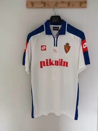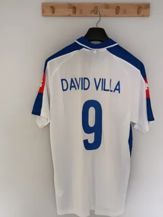 Camiseta de fútbol retro del Equipo Real Zaragoza con el nombre y dorsal de David Villa 7. - Talla XXL en etiqueta pero da talla como una XL - Diseño clásico en blanco con detalles azules y rojos. - Logo de Lotto en el pecho. - Escudo del equipo en la parte frontal. - Inscripción 'Pikolin' en grande.