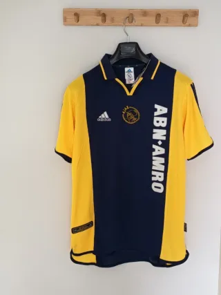Camiseta de fútbol retro del Ajax con el patrocinio de ABN AMRO. Diseño clásico en azul y amarillo. - Talla XXL en etiqueta pero da talla como una XL - Logo del Ajax bordado. - Inscripción ABN AMRO en la parte frontal. - Detalles de las tres franjas de Adidas en las mangas.