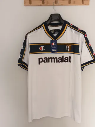Camiseta de fútbol retro del equipo italiano Parma con el nombre y dorsal de Adriano 9. - Talla XXL en etiqueta pero da talla como una XL - Cuello en V con detalles en amarillo y azul marino. - Rayas laterales con el logo de Champion. - Inscripción 'parmalat' en el frontal.