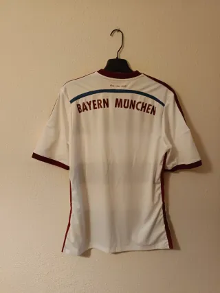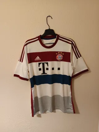 Camiseta de fútbol del Bayern de Múnich de la temporada 2014/2015. - Diseño con franjas horizontales en blanco, azul y gris. - Detalles en color burdeos en cuello y mangas. - Escudo del club y logo de Adidas en el pecho. Original. Se encuentra en perfecto estado.