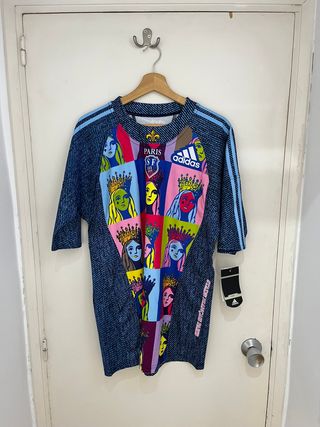 Camiseta de fútbol Adidas de la temporada 2008 del Stade Francais. - Diseño multicolor con estampado gráfico. - Mangas con las icónicas tres rayas de Adidas.