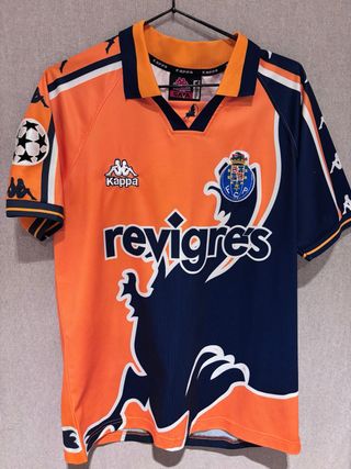 Camiseta de fútbol del FC Porto, temporada 1999, usada por Vítor Baía. Edición especial Champions League. - Diseño icónico en naranja y azul. - Detalles del club y patrocinador. - Logo de Kappa en mangas y pecho.