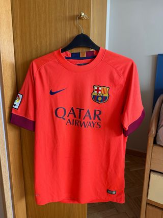 Camiseta de fútbol del FC Barcelona, segunda equipación de la temporada 2014-2015 con el nombre de Suárez. - Diseño en color naranja. - Escudo del club y logo de Nike. - Patrocinador Qatar Airways. - Parche de La Liga