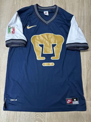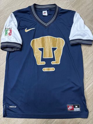 Camiseta de fútbol de los Pumas de la UNAM, con el diseño clásico del equipo. - Mangas blancas. - Logo de Nike bordado. - Escudo del equipo en grande. - Parche de la FMF en la manga.