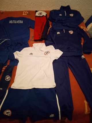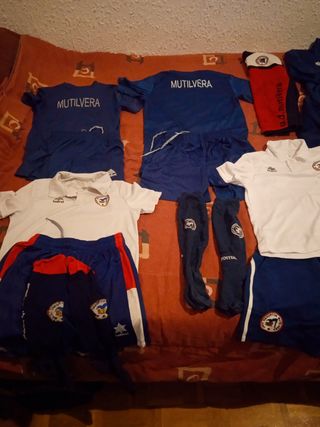 Toda una equipación de entreno y de paseo del club de fútbol U.D. Mutilvera, Con dos conjuntos de paseo, dos conjuntos entreno, con pantalón y jersey+ 2 jersey de repuesto+ Abrigo plumas, más 6 camisetas de entreno y dos pantalonetas y más ver fotos. Tallas Benjamín de 8 y 9 años. (Acepto cambios) Precio a negociar