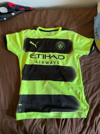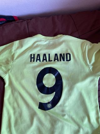 Vendo camiseta de fútbol del Manchester City, de la marca Puma. Es de color verde lima y negro. - Camiseta de manga corta. - Lleva el nombre y número de Haaland (9). - Está en buen estado.