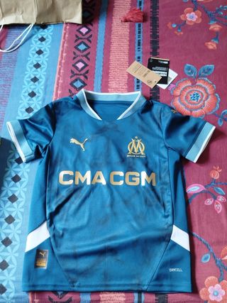 Camiseta de fútbol del Olympique de Marseille con detalles dorados. - Tecnología Drycell para mayor transpirabilidad. - Diseño con logo de Puma y escudo del club. - Inscripción CMA CGM en el frontal. Talla 8 pero para un niño de 3 a 5 años