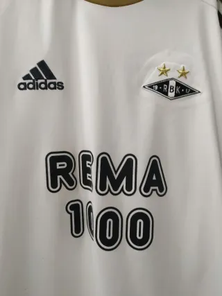 Camiseta de fútbol del Rosenborg BK. - Diseño blanco con detalles en negro y dorado. - Logo de Adidas y escudo del club. - Inscripción REMA 1000 en el frontal.